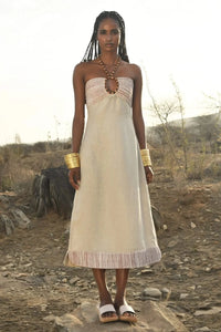 Imani is a wearer's delight. It is a long dress with a hand-beaded neckline that is tied up around the neck, adorning it like a necklace. Striped khadi elements and a pure linen body give this halter dress a subtle yet striking look and feel.