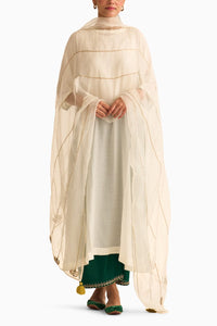 Featuring a beautiful and serene ivory kurta set teamed with an hand embroidered organza dupatta and a contrast pant to give a beautiful accent detail.