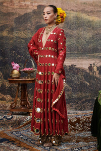 Red Anarkali made in khaddar silk fabric with real mirrors and ghungroo work on kurta and pants, paired with a organza dupatta with mirror border.