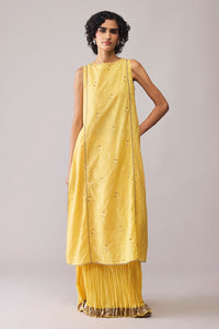 Featuring a sleeveless Chanderi kurta adorned with delicate gold embroidery, designed to feel modern, minimal, and timeless. Paired with a crushed voile lehenga skirt that brings texture and graceful movement to the ensemble.