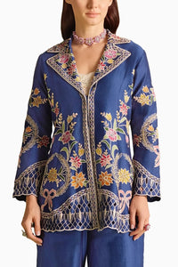 Featuring indigo chanderi applique, threadwork and beadwork flared jacket.