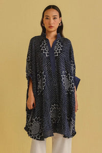 Featuring the Indigo Bandhani Shirt Dress with Pintucks by 29 India's Sunehri collection. Handcrafted in Gajji silk Bandhani by Kutch artisans, this high-low shirt dress is styled with delicate pintuck detailing, blending traditional artistry with a contemporary, fluid silhouette.