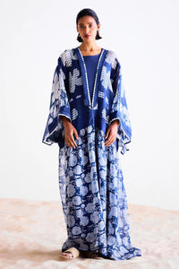 Featuring Indigo Block Printed Kimono Dress by Cotton and Clay, a graceful two-piece ensemble crafted from luxurious hand block-printed chanderi fabric. The flowing kimono-style dress comes with a matching inner, offering a perfect blend of traditional artistry and contemporary elegance in rich indigo tones.