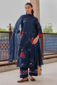 The Indigo Bloom Applique Kurta Set showcases contrasting blooms with delicate thread detailing on the kurta and sleeves. Paired with matching pants featuring printed blooms and a dupatta embellished with applique blooms and our signature tassels, it creates a graceful, festive-ready ensemble.