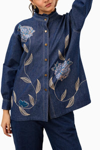 A chic indigo denim coord set featuring mandarin- collar button down top with statement floral embroidery.