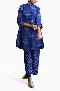 Featuring Indigo Blue Chand short kurta with custom chand motif in bandhani paired with pants.