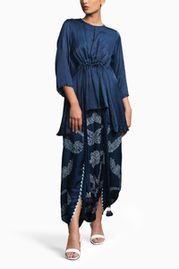 Featuring Indigo Blue Origami bandhani dhoti style skirt paired with top with adjustable waist belt and tassle details.