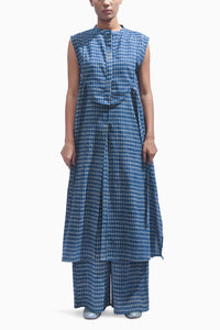 Repurposed chambray hand block-printed in soft indigo forms a modern modular set — a slit tunic paired with wide trousers and a detachable yoke.