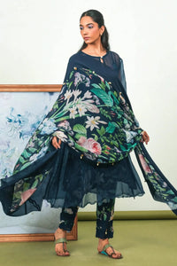 Featuring the Indigo Chiffon Phiran Set by Sage Saga's Valley of the Night collection. This elegant ensemble includes a chiffon phiran adorned with delicate embroidery, paired effortlessly with crepe embroidered pants and a flowing chiffon dupatta for a timeless look.