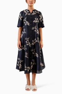 Experience timeless elegance with our Indigo Discharge Print Shirt Dress crafted from luxurious silk chanderi. This dress features a flattering princess line silhouette, adding sophistication to your ensemble.