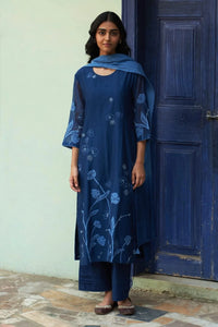 The Indigo Floral Embroidered Kurta Set showcases scattered floral appliqué details across the kurta, adding a subtle charm. Paired with matching pants and a contrasting dupatta, this ensemble offers a perfect blend of elegance and ease, ideal for festive gatherings and intimate celebrations.