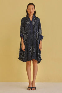 Featuring the Indigo Gajji Silk Bandhani Dress with Pintucks by 29 India's Sunehri collection. Hand-tied and dyed in Gajji silk Bandhani by Kutch artisans, this V-neck dress features a mandarin collar, drawstring sleeves, and delicate pintuck detailing for a refined, artisanal look.