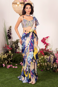Indigo Ink Cowl Ruffle Saree with Embellished Corset