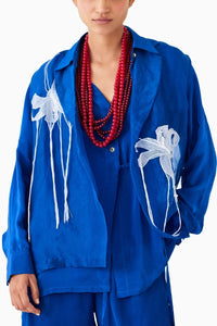The Indigo Organza Jacket crafted from our stunning organza fabrication, trans-seasonal, is a statement piece. The jacket, made in our hand dyed organza has a collar and lapel. It has a straight fit. It has been hand embroidered with flower motifs with hanging threads. It can be paired with our matching Indigo shirt . Trousers Co-ord. Wear it with heels for an elegant look.