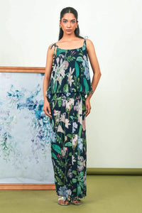 Featuring the Indigo Valley Dhoti Skirt Set by Sage Saga's Valley of the Night collection. A breezy chiffon top with delicate coin and shell detailing is paired with a beautifully draped crepe dhoti skirt, blending coastal charm with graceful elegance.