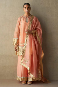 The Indira Coral Organza Ensemble features a light, airy silk organza kurta and matching sharara, adorned with museum-quality hand embroidery in dabka, pearls, and zardozi. Metal gota borders enhance the regal look. The flowing odhni completes the set with Mughal-inspired motifs and intricate embroidery on its pure silk organza base.
