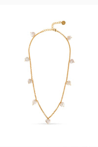 The Infatuation Chain Pearl necklace features soft, pale pink pearls, delicately strung on hypoallergenic brass for a secure and comfortable fit. The 22k gold-plated chain adds a luxurious touch, enhancing the gentle hue of the pearls. This elegant design effortlessly complements any outfit, making it perfect for both casual and formal occasions.