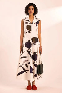 A statement dress crafted in cotton twill, featuring an expressive artsy print in deep ink tones against an ivory base. Designed with a structured yet flowing silhouette, it includes a tailored collar, fitted bodice with concealed zip, and a flared skirt with delicate button details at the waist.