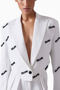 Introducing our Insignia Ivory cropped blazer, featuring Cilvr's signature metal monograms for a touch of luxury. With a cropped length and tailored silhouette, this blazer boasts peaked lapels that add a sophisticated edge to any outfit. Perfect for adding a chic layer to your ensemble, whether paired with trousers or a dress, this blazer combines elegance with modernity.