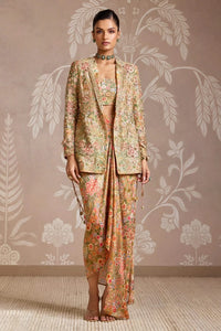 Featuring Intertwine Olive Green Jacket Skirt Set by Ridhi Mehra's In the Folds Summer Collection '25. This elegant coord set includes an allover embroidered printed raw silk jacket, paired with an embroidered printed fine silk bustier and a printed fine silk drape skirt. The olive green tone and intricate embroidery create a perfect balance of sophistication and modern charm.