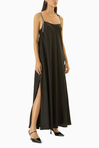 Featuring Iqra Dress with thin strap square neckline. It has a conceal zipper and a both side slits till knee. Embellished hanging chain on strap of the dress to give that classy look.