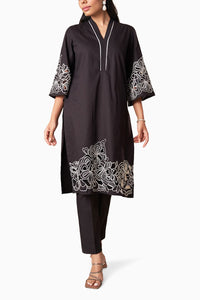This elegant ensemble features a classic black kurta and matching pants, perfect for both formal and casual occasions. The outfit is crafted from high-quality fabric, offering a comfortable and flattering fit. It is adorned with intricate white floral cut work embroidery along the sleeves and hem, adding a sophisticated and artistic touch. Paired with straight black pants, this outfit exudes a timeless elegance that is sure to make a statement. Complete the look with your favorite accessories and footwear for an effortlessly chic ensemble.