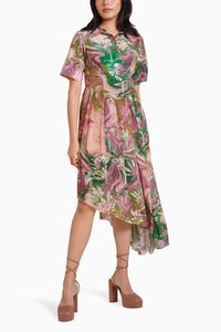 Cut in printed crepe, this midi dress features soft pleats at the hem, a polo neckline, and gently flared short sleeves. The curved waistband cinches the waist while the asymmetric silhouette adds graceful fluidity with every step.