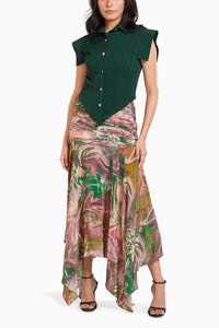 This two-piece set pairs a sculpted, sleeveless shirt with a pointed hem and gold button detailing, with a fluid midi skirt cut in an asymmetric silhouette. The contrast between structure and ease gives the look a clean, confident edge.