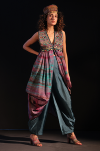 Step into elegance with the captivating ensemble featuring the tie-dye corset blouse, plain triangular dhoti pants, and embroidered cowl cape. The corset blouse, crafted from luxurious habutai silk, boasts a mesmerizing tie-dye pattern that merges artistry with modern sophistication. Paired harmoniously, the plain triangular dhoti pants offer a relaxed yet chic contrast, enhancing the ensemble with their flowing silhouette and effortless grace. Completing the look, the embroidered cowl cape drapes gracefully over the shoulders, adding a layer of intricate detail and refinement. Perfect for special occasions or cultural celebrations.