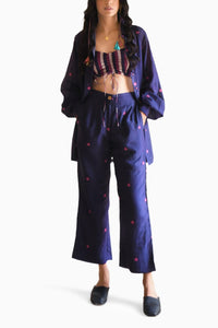 This is a classic three-piece co-ord set made in chanderi silk. It comes with an adjustable smocked strappy corset which has a tie-up in the front for the perfect fit, comes with a collared oversized printed shirt with bishop sleeves, and a pair of matching straight high-waist pants with side pockets to complete the look.