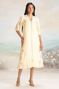 A fit-and-flare mandarin-collared dress featuring side panels and 3/4 sleeves, beautifully finished with delicate organza edging. The design is hand-screen printed to create a watercolor-like effect, with six colors applied in layers using brushstrokes through screens, bringing Iris flowers to life in a soft, flowing pattern. A layer of gold foil is crafted over the printed artwork, adding a striking touch of elegance. A delicate floral design, meticulously hand-embroidered with soft cotton threads, creates an intricate and charming pattern on the neckline and cuffs, enhancing the dress's graceful and refined appeal.