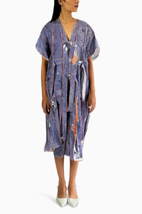 The Iris - Emblem is meticulously hand-marbled by skilled artisans, featuring an organic design that flows naturally across each panel. Each piece is cut and reassembled with visible out stitching in contrasting thread, emphasizing the attention to detail and impeccable quality. With seams stitched on the outside, this piece celebrates the inside-out approach, showcasing a level of finish that highlights the garment's artistry and precision.