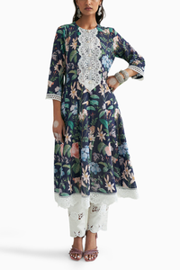 Featuring printed Lawn Kalidar Kurta, with intricate lace detailing, paired with a lawn embroidered palazzos with lace detailing and chanderi embroidered dupatta.