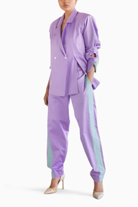 Featuring peri purple relaxed summer jacket. Classic double collars with front shell button fastening. Vintage front panel slits and the cuffs are lined with contrast colour. Shoulder pads, no brainer. Paired with peri purple vintage pants. A contrast side stripe. Zip and button fastening in the front with side pockets.ÂÂ