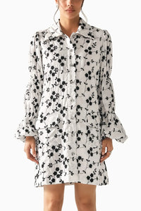A sophisticated shift button-down dress with an all-over black floral print on a crisp white base. Featuring voluminous sleeves and a structured collar, this dress is perfect for an effortlessly polished look. The tiered hem adds movement, making it ideal for both workwear and casual outings.