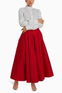 Featuring Iris White Shirt with Phoenix Red Skirt by Malie. This co-ord set includes a white shirt with a red hue skirt. The shirt has a mandarin collar with frill detailing, adding a touch of elegance. It is a regular shirt with full elasticated sleeves and an A-line body shape, ensuring both comfort and style. Paired with an ankle length skirt, which has insert pockets for added convenience. It comes in a vibrant red color.