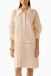 Discover the perfect blend of polish and femininity with our classic shirt dress. Crafted from 100% cotton slub, this midi-length dress features a striking exaggerated collar with zig-zag details that adds an edgy touch to its simple silhouette. The 3/4th balloon sleeves with buttoned cuffs and lace accents on the body and sleeves complete the look, while the front button placket ensures effortless style.