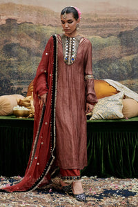 The suit is crafted from crushed tissue fabric, the neckline is adorned with intricate embellishments, featuring delicate mirror work the suit, with slip is paired with crushed tissue lined with chanderi pants, a organza dupatta.