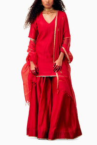 This rich red kurta, crafted from Chanderi fabric, features elegant bijiya gota lace at the hemline and sleeves, with a convenient side zipper opening. It is paired with matching Chanderi sharara pants that have a side zipper and button fastening. The look is completed with an embroidered Kota Doriya dupatta in silk, adorned with gota lace at the hem. Both the kurta and sharara are fully lined, and the kurta’s V neckline adds a touch of sophistication.
