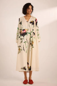 A relaxed, timeless A-line dress in watercolor- inspired floral print, crafted in cotton mul. Featuring a V-neckline, long sleeves, side pockets, and a belt for versatile styling. Light, effortless, and perfect for any day.