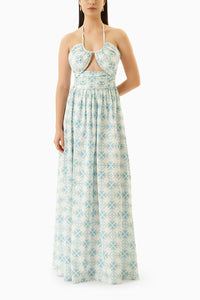 There is hand-daped detailing around the waistline, open back and a "u" neckline that ties behind the neck. It's made from sustainble cotton poplin and printed in a dove blue geometric design.