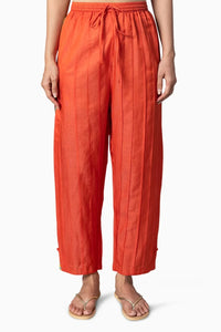 Isolde Pajama crafted in luxurious coral silk cotton satin, is adored with vertical pintucks and fine tucks, featuring side panels of digitally printed stripes.