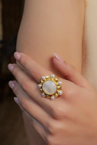 Looking for a pearl ring that’s elegant, understated and interesting? Then this 22kt gold plated ring is what you are looking for. The ring beautifully captures the luminosity of pearls and is contrasted with the vibrance of 22kt plated frame. The while and gold palette, is a never fail, classic combination. Neutral, eclectic and versatile, the ring has everything a woman on the go needs! Finish the look with matching earrings from the collection.