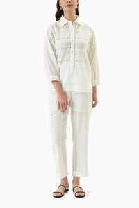Featuring a contemporary yet chic vibe to your wardrobe with this co-ord set It's cut in eyelet fabric, white colour, collared neckline with front opening and quater sleeve details. This is a straight fit pair. Elevate your look by matching it with slip-on sandals, a canvas clutch and drop earrings.
