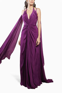 Introducing a mesmerizing deep purple gown that exudes elegance and sophistication. This enchanting ensemble features twisted gathers, creating a unique and eye-catching texture that adds depth and intrigue. The gown showcases a deep V neckline, gracefully highlighting the collarbones and exuding a touch of allure. A shoulder trail elegantly cascades down, adding a touch of drama and capturing attention with every step. Completing the stunning design is a low back, revealing a tasteful glimpse of skin and adding a sensual touch to the overall look.