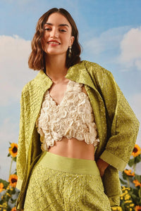 Featuring the Ivory 3D Floral Bustier by 29 India's Sunehri collection. Designed in an ecru tone, this bustier showcases intricate three-dimensional floral embroidery and a mirrorwork belt, offering a delicate yet statement-making silhouette crafted with exceptional attention to detail.