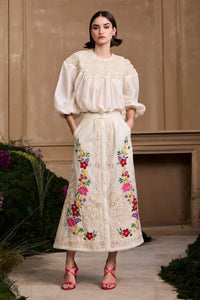 This elegant ensemble pairs an ivory Chanderi 3D rose appliqué yoke detail top with an ivory Chanderi floral threadwork and beadwork button-down skirt, creating a sophisticated and harmonious look. The top features delicate 3D rose appliqué on the yoke, adding a textured, modern touch to the soft Chanderi fabric. The button-down skirt, adorned with intricate floral threadwork and beadwork, brings a refined, timeless appeal.