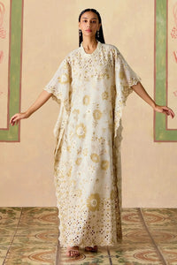 Featuring an ivory and gold silk organza long kaftan adorned with metallic applique, intricate beadwork, and delicate cutwork detailing.
