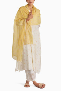 Introducing the Handwoven Chanderi Ivory Color Kurta, beautifully adorned with a delicate Florrete digital print. This elegant kurta is paired with a lemon color half-width stole, adding a fresh and vibrant contrast. Complemented by comfortable cotton trousers, this ensemble offers a chic and refined look perfect for any occasion.