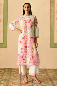Featuring an ivory and pink chanderi colour block kurta with exquisite applique, beadwork, and cutwork, paired with ivory chanderi pants adorned with matching applique and delicate beadwork.